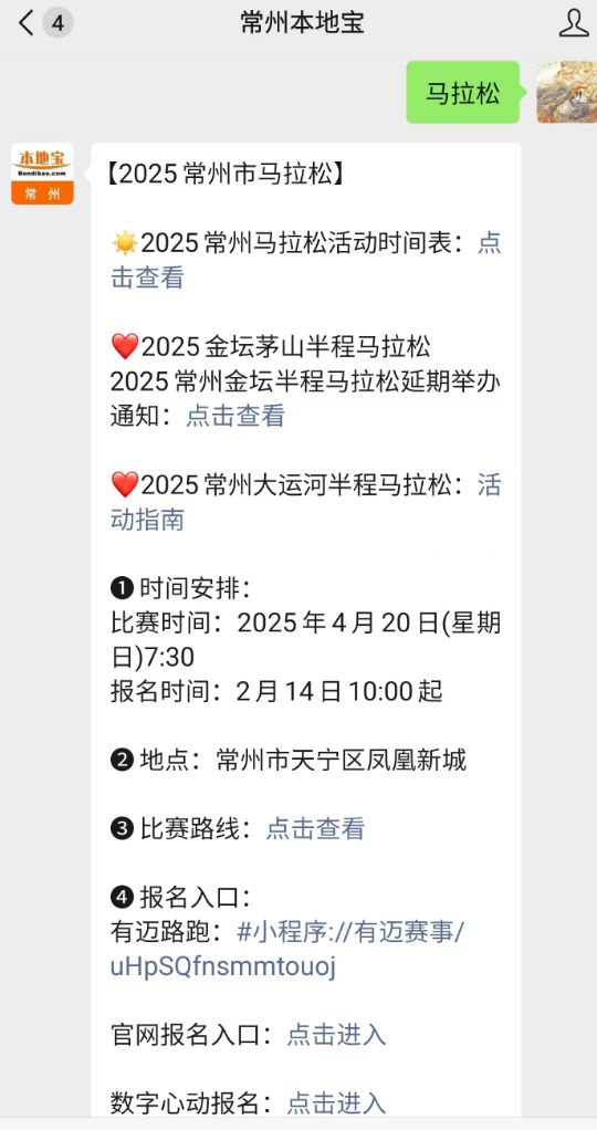 温馨提示:微信搜索【常州本地宝】公众号,关注后在对话框回复【马拉松】可获常州马拉松2025时间表、2025常州大运河半程马拉松/钟楼半程马拉松报名入口、报名时间、比赛时间、比赛路线、领取、赛事规程、奖励政策等信息。